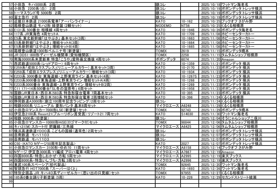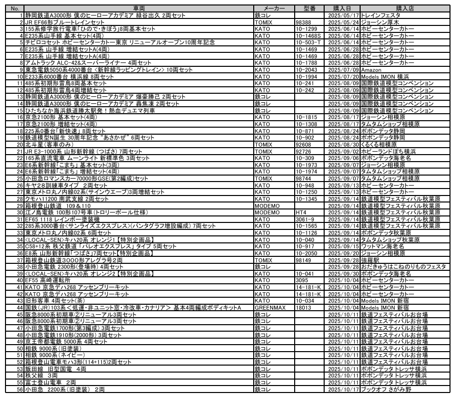 というわけで、今年買った車両リストを公開しちゃおうと思う。すべてNゲージで、新品と中古が混在している。